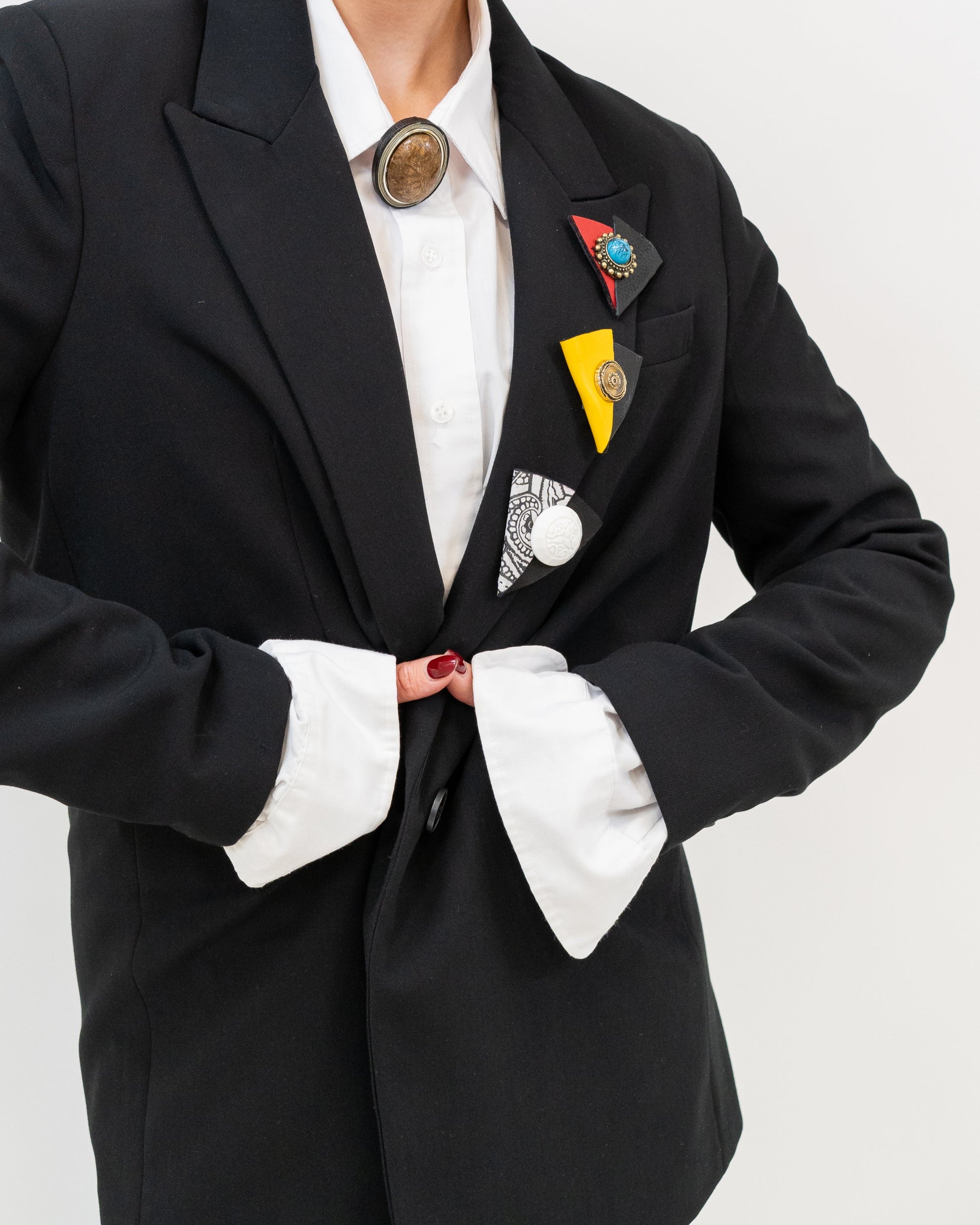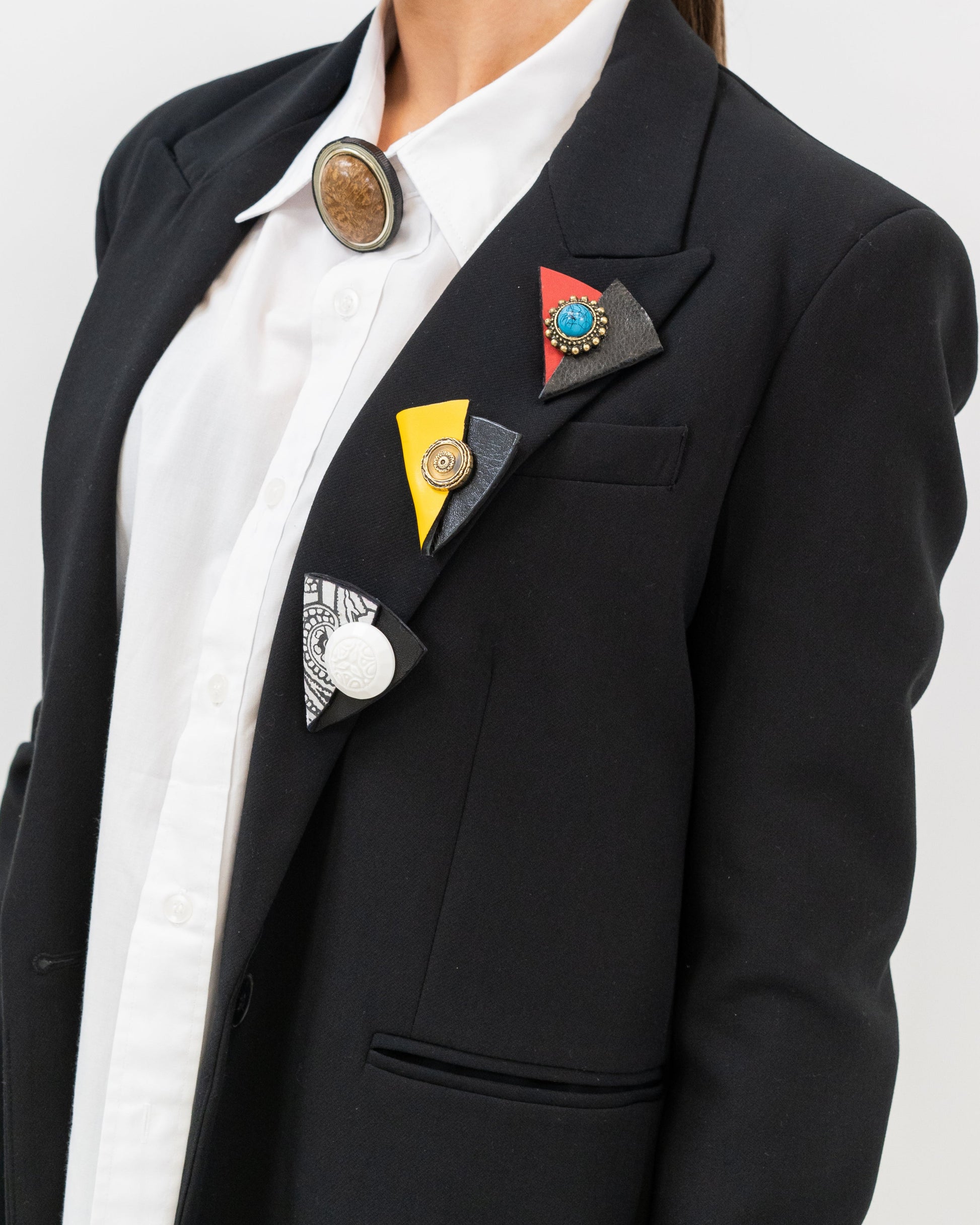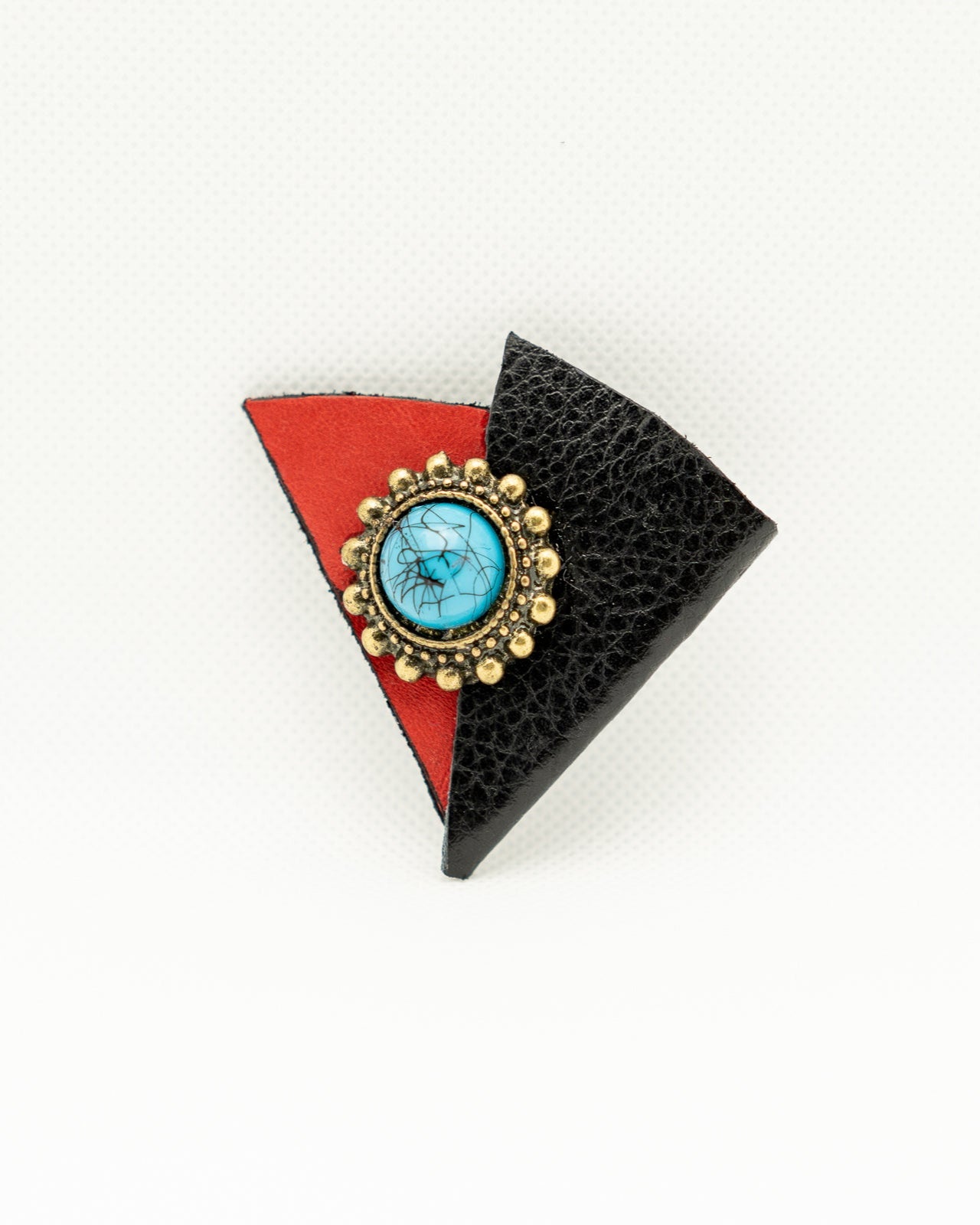 TRENI - bold brooch combines textured black and red leather with a striking turquoise stone framed in antique gold. Its geometric shape and vivid contrast create a look that’s both modern and timeless. A standout accessory for adding elegance with an edge.