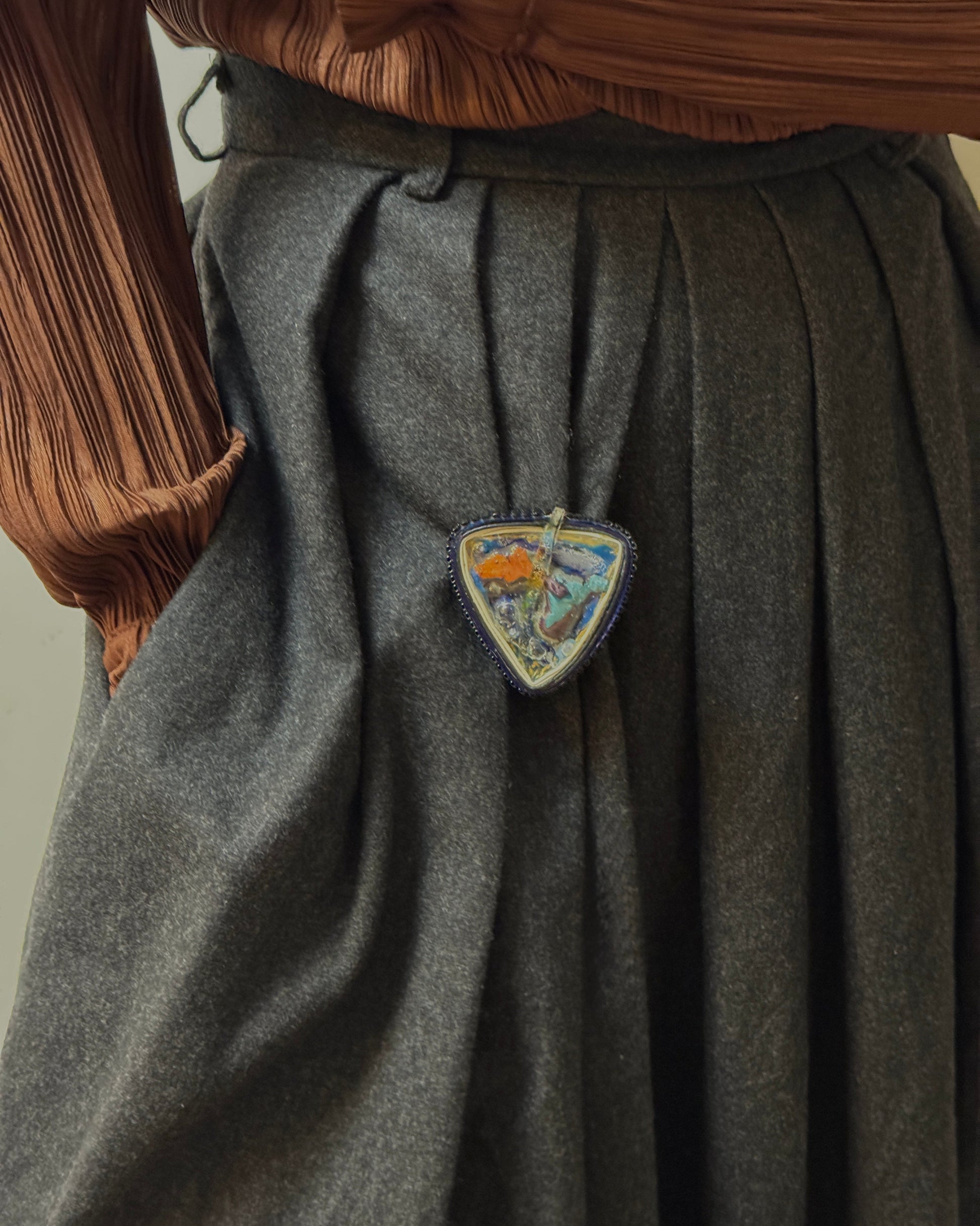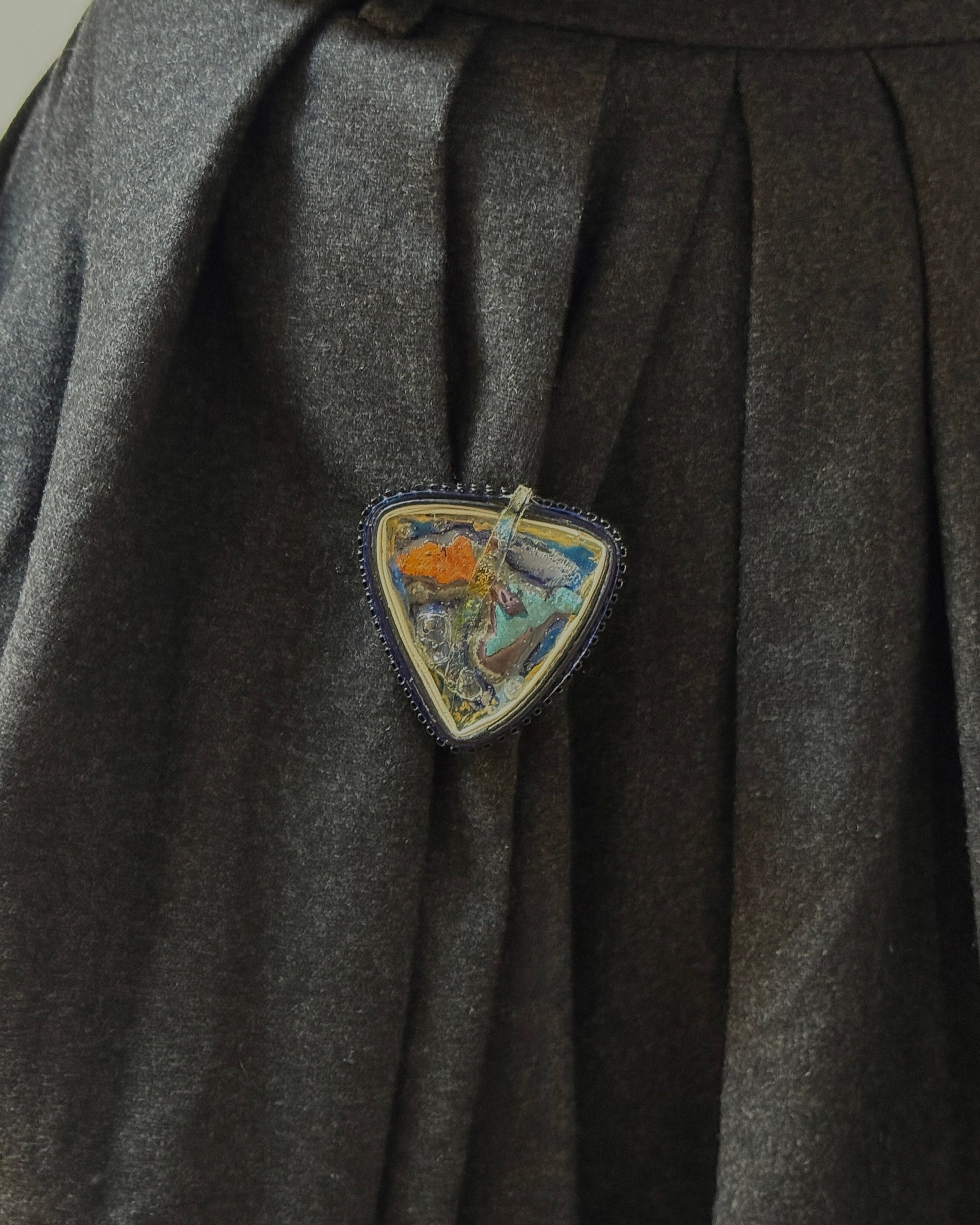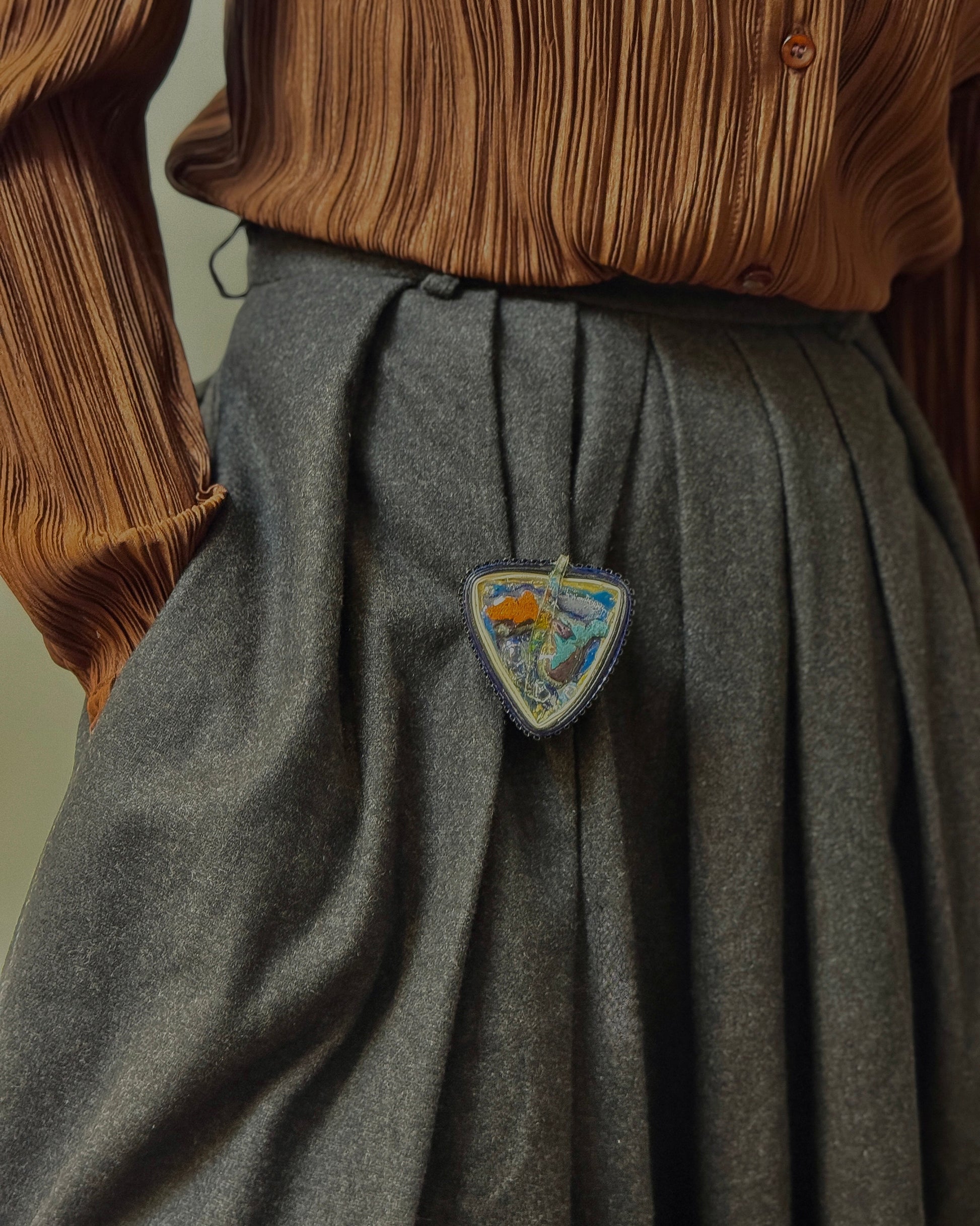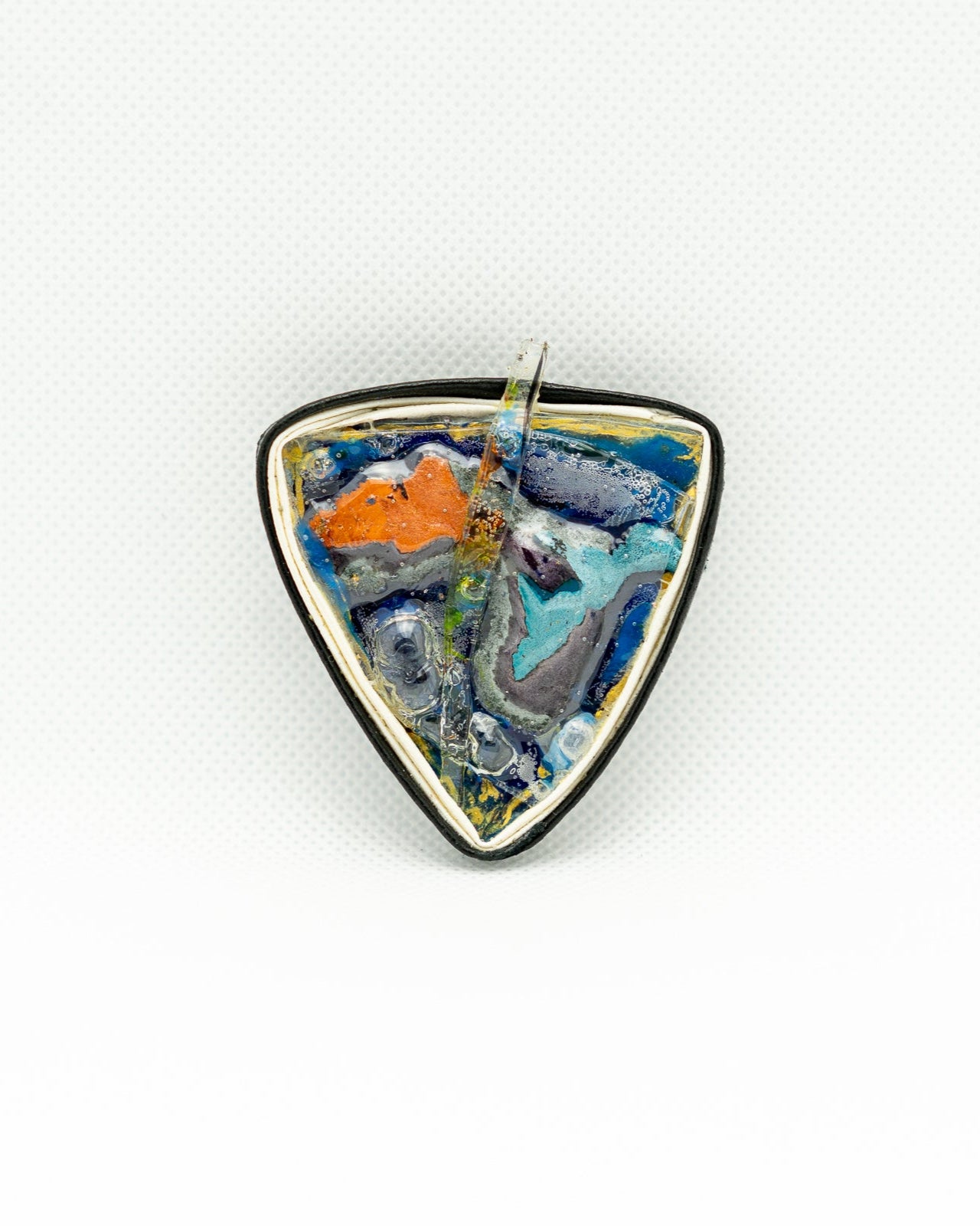 TRIOTI - bold triangular brooch showcases an abstract landscape in vivid swirls of orange, teal, blue, and violet. Encased in a sleek metallic frame, its layered textures and dynamic lines create a sense of movement and depth. A striking piece for those who love wearable art with a contemporary edge.