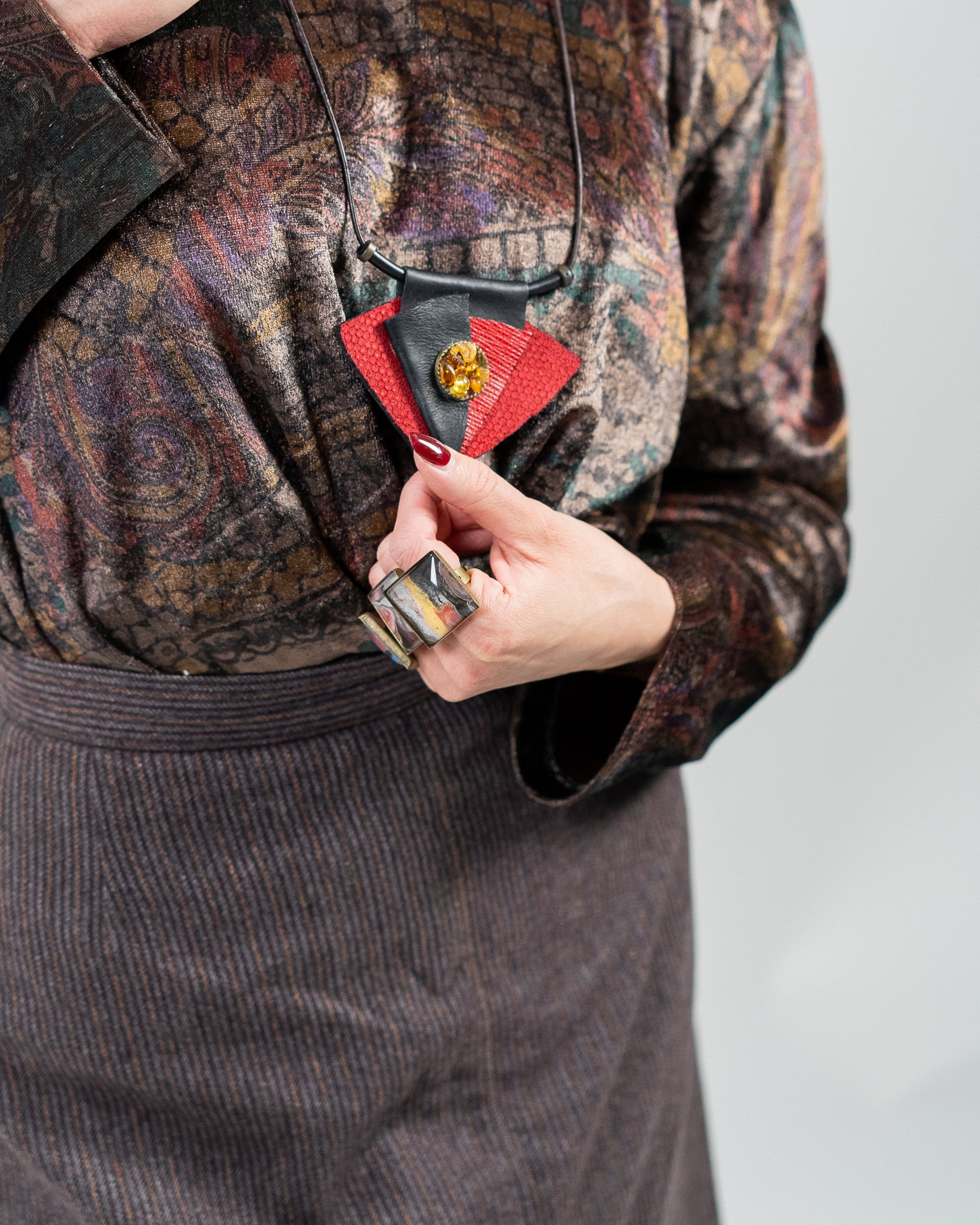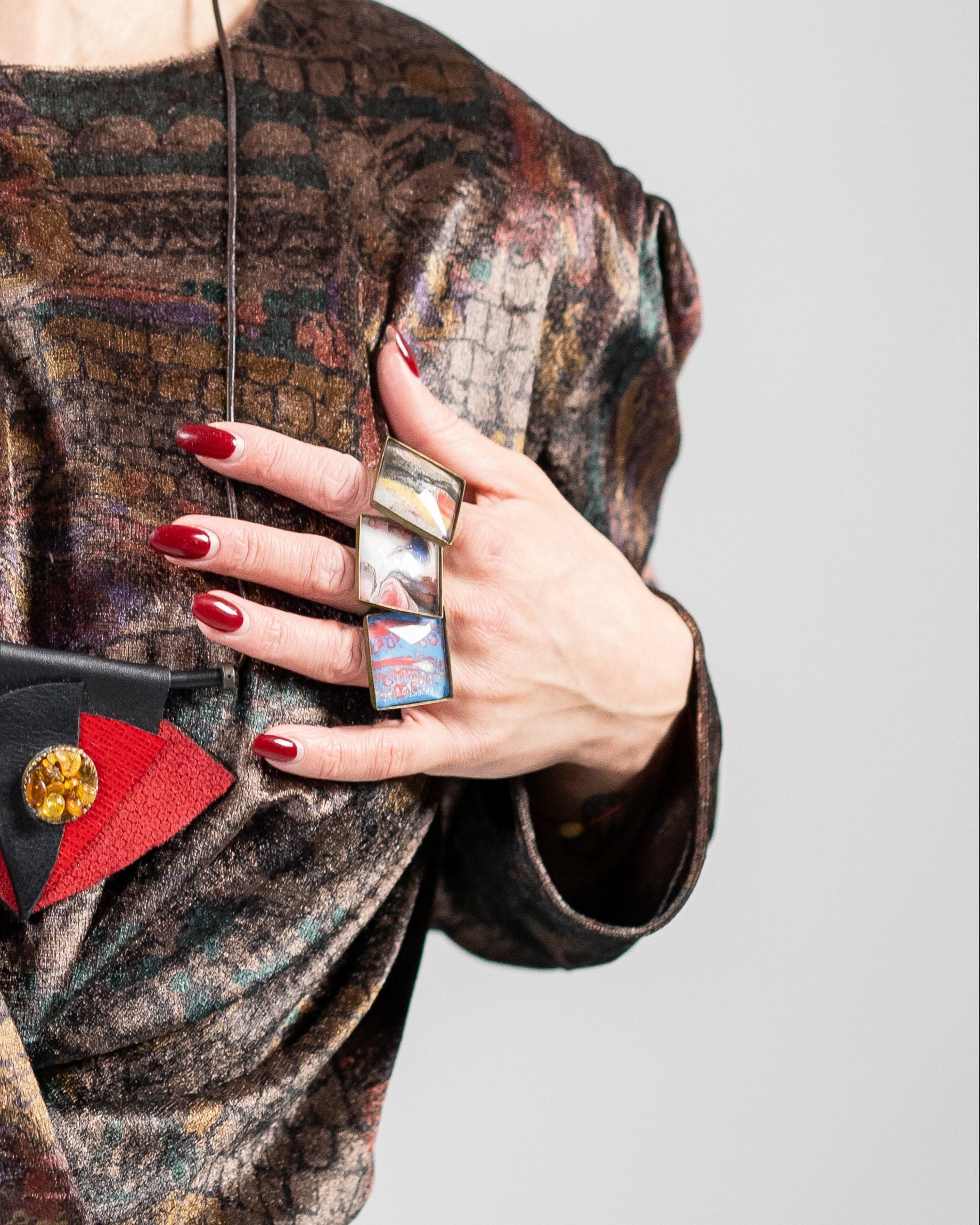 VASVU - striking square ring features a bold blend of yellow, coral, black, and silver hues, flowing together in a mesmerizing abstract pattern. The glossy finish enhances its vibrant depth and movement. A perfect statement piece for lovers of modern, artistic design.