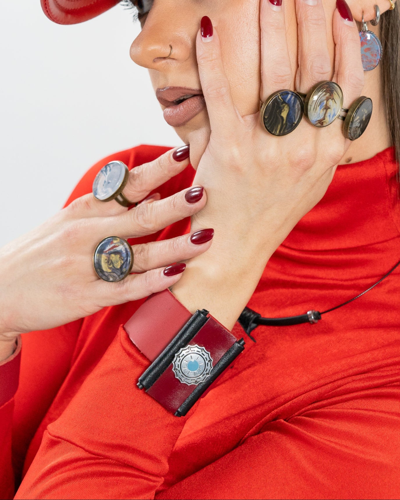 VERDE features a vibrant red tone and a metallic sun element, adding a touch of elegance to any outfit. The premium leather material is durable and comfortable, making it a perfect accessory for everyday wear. Enhance your style with this luxurious accessory.