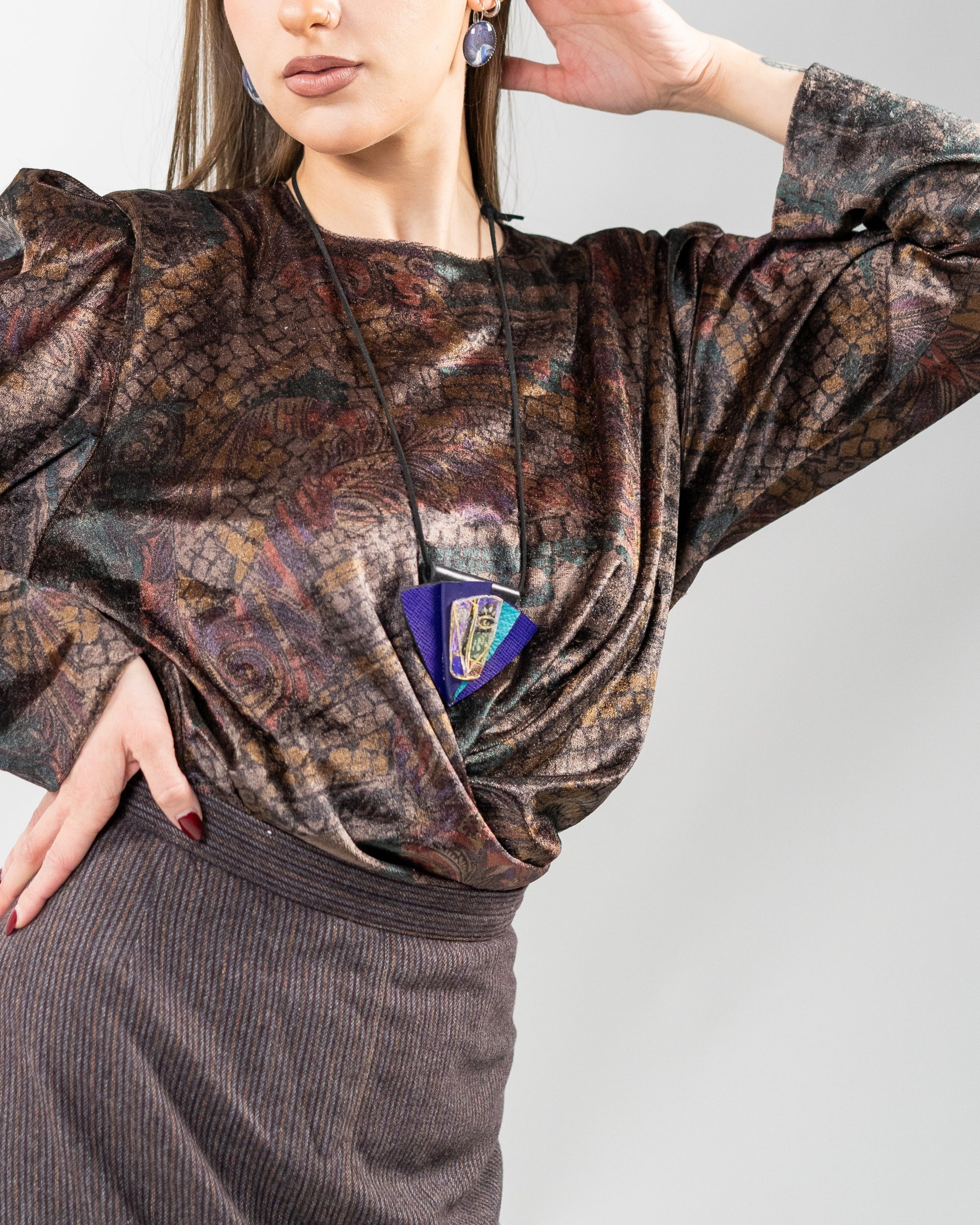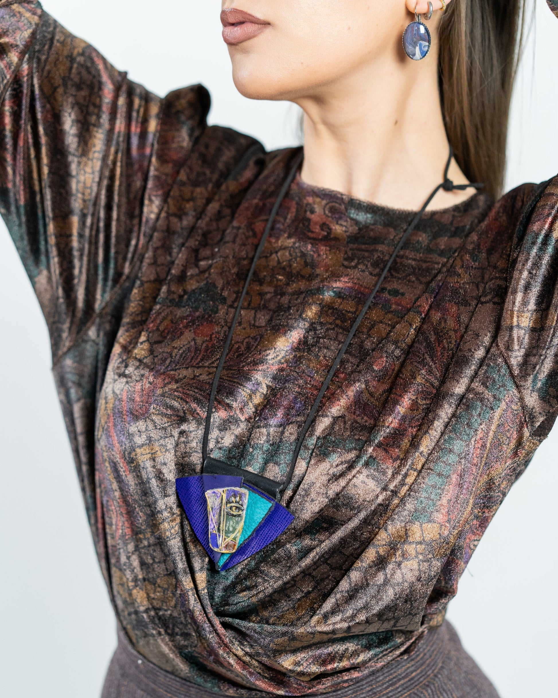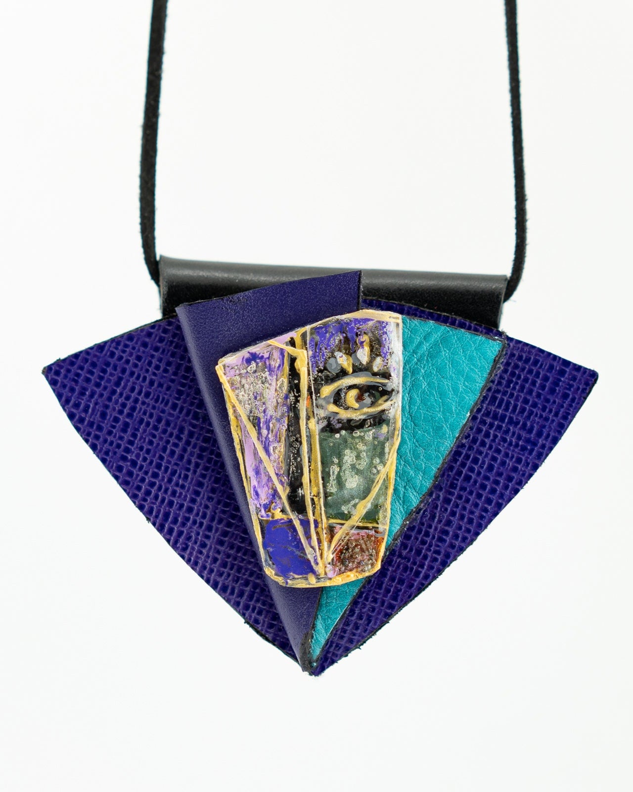 VINTO - striking fusion of texture and symbolism, this pendant features layered leather in rich purples and teal, crowned by a hand-painted element with a captivating eye motif. The bold geometric shape adds modern structure to the mystical design.