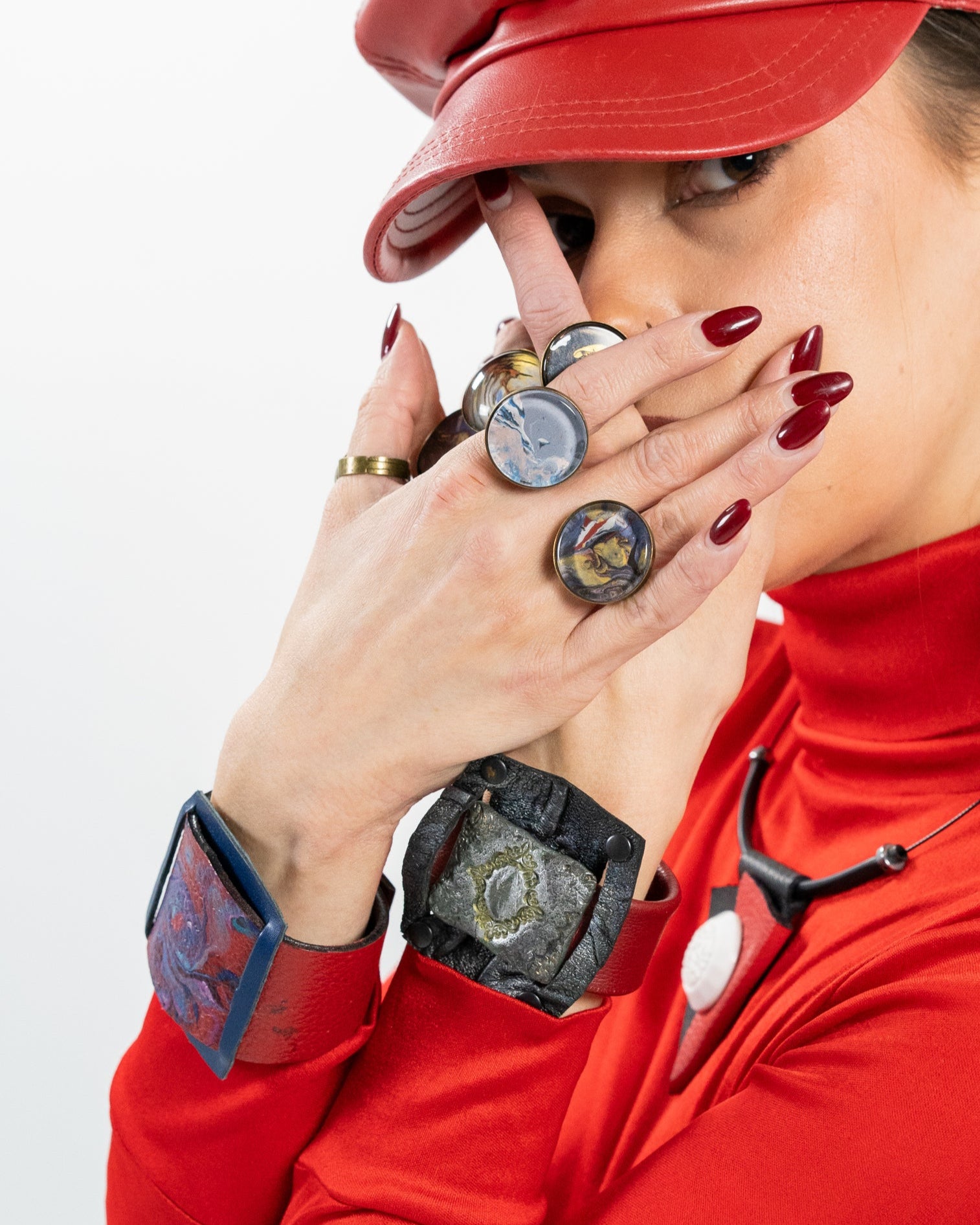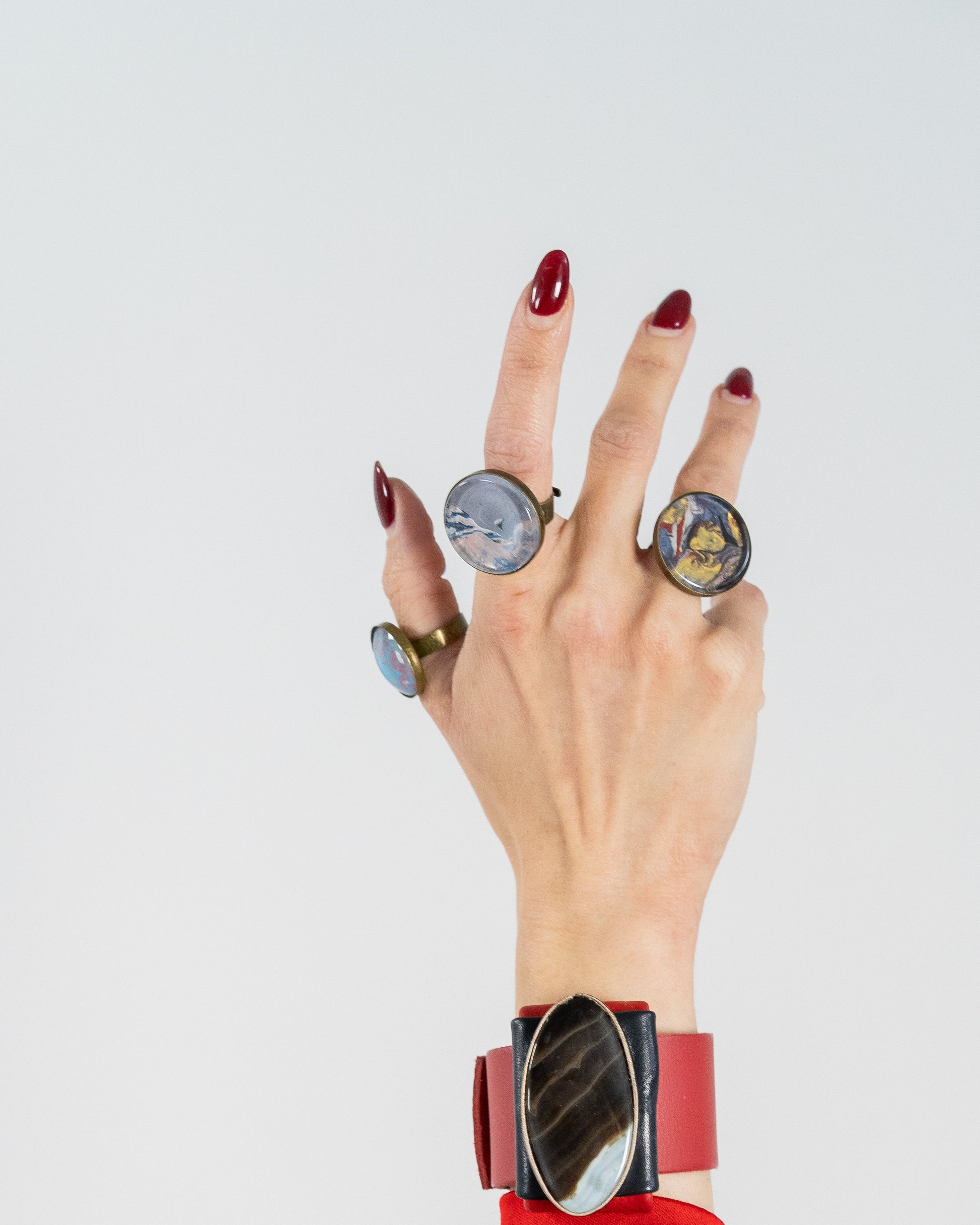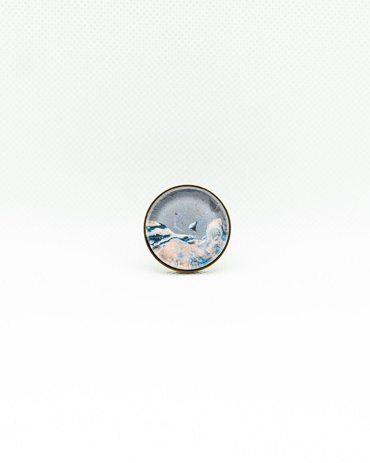 YAKTU - elegant round ring features a serene swirl of soft blue, ivory, and sand tones, reminiscent of ocean waves. Its smooth, glassy finish enhances the calming, organic design. A subtle yet captivating accessory perfect for everyday sophistication.