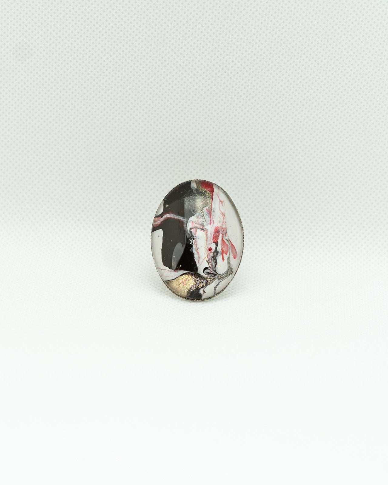 YTUGU - bold oval ring showcases an abstract swirl of black, white, red, and gold hues beneath a glossy dome finish. Its fluid, painterly design gives it a modern, artistic edge. A statement piece that effortlessly blends sophistication with creativity.