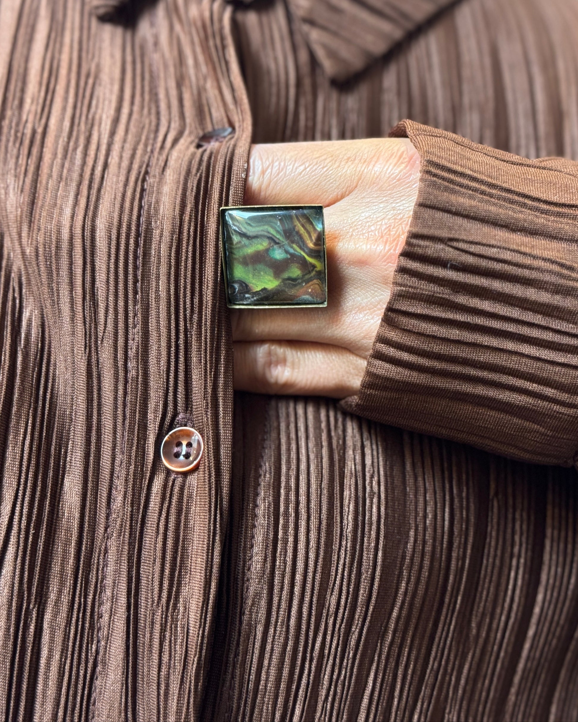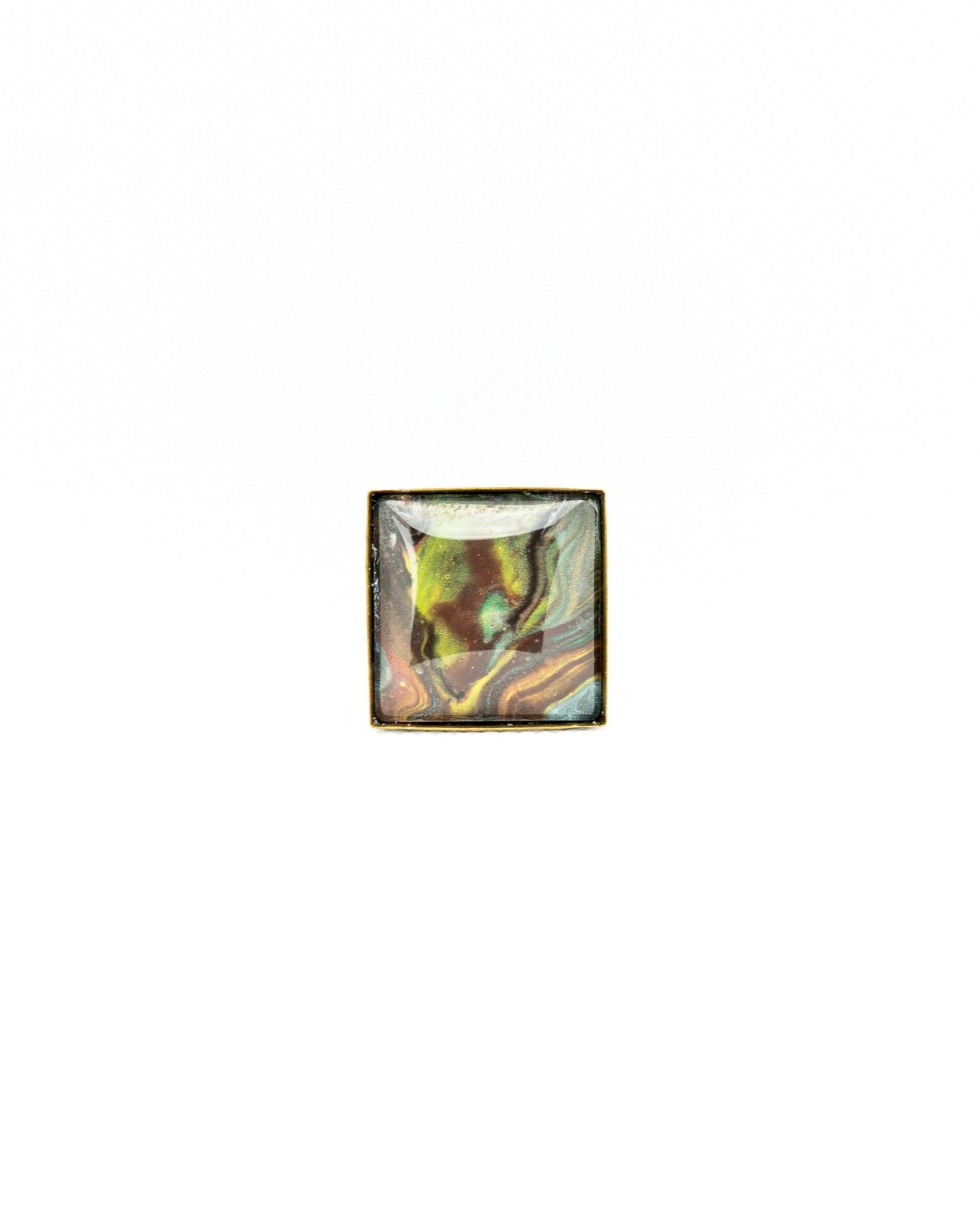 YTUSU - striking square ring features a mesmerizing swirl of earthy greens, golds, and copper hues under a glossy finish. Its abstract, fluid design captures light beautifully, making each piece one-of-a-kind. A bold statement accessory for those who love wearable art.